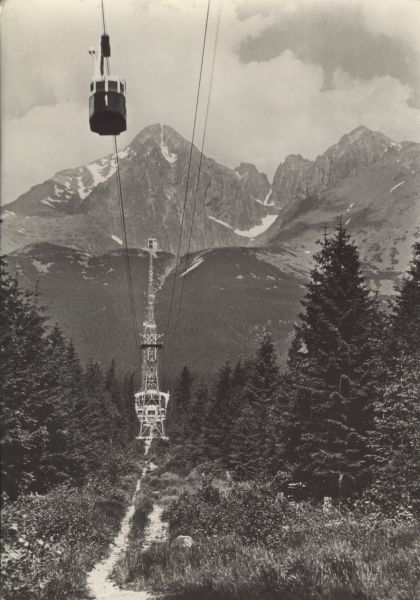 Wagonik kolei linowej na trasie nad Łomnicki Staw. Na pierwszym planie drzewa i stacja pośrednia - Start. Wyżej stacja nad Łomnickim Stawem. W tle Łomnica, Widły i Kieżmarski Szczyt.