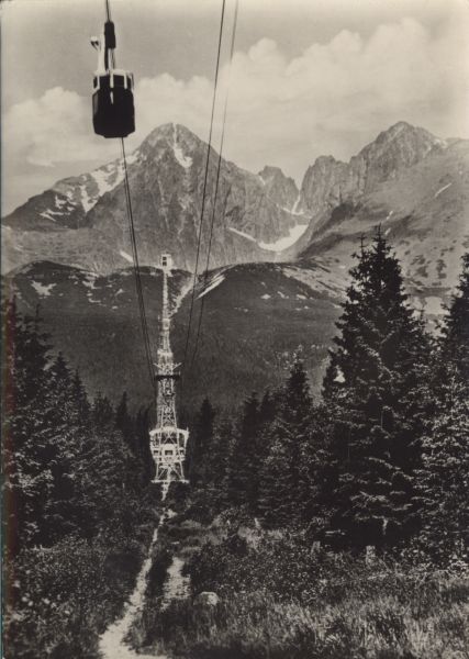 Wagonik kolei linowej na trasie nad Łomnicki Staw. Na pierwszym planie drzewa i stacja po¶rednia - Start. Wyżej stacja nad Łomnickim Stawem. W tle Łomnica, Widły i Kieżmarski Szczyt.