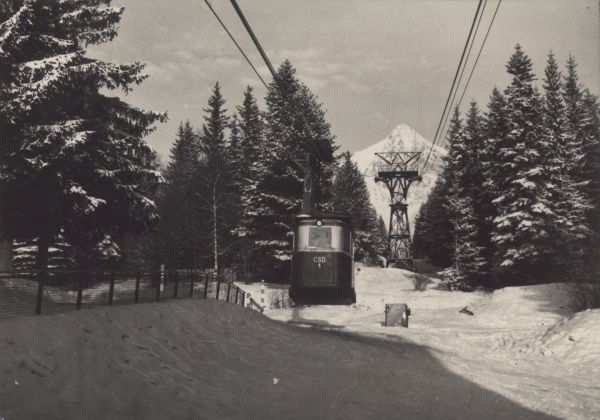 Wagonik kolei linowej na Łomnicê po opuszczeniu stacji w Tatrzańskiej Łomnicy w zimowej scenerii. W tle widoczna Łomnica.