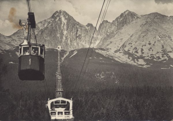 Wagonik kolei linowej na Łomnicê na trasie do Łomnickiego Stawu. Widoczna stacja po¶rednia - Start. W tle Łomnica, Zachodni Szczyt Wideł, Przełêcz w Widłach, Wielki Szczyt Wideł i Kieżmarski Szczyt.