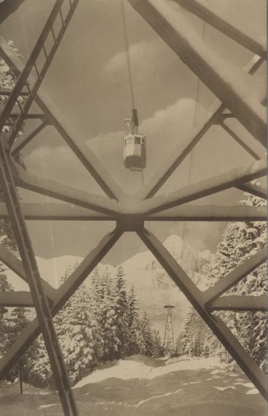 Wagonik kolei linowej na trasie do Łomnickiego Stawu w scenerii zimowej. Na pierwszym planie przęsła podpory. W tle Łomnica i Zachodni Szczyt Wideł.