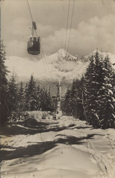 Wagonik kolei linowej na trasie do Łomnickiego Stawu w scenerii zimowej. W tle Łomnica i Kieżmarski Szczyt.