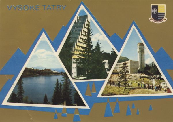 Budynek telekomunikacji z wieżą transmisyjną. W prawym górnym rogu herb miasta Szczyrbskie Jezioro. U góry napis: VYSOKÉ TATRY.