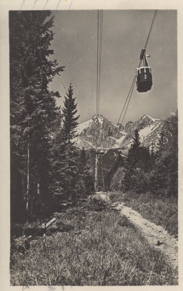 Wagonik kolei linowej na Łomnicę na trasie do Łomnickiego Stawu. W tle Łomnica, Widły i Kieżmarski Szczyt.