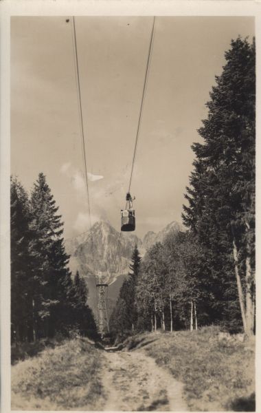 Wagonik kolei linowej na trasie nad Łomnicki Staw. Na pierwszym planie drzewa, wyżej widoczna stacja nad Łomnickim Stawem. W tle Łomnica, Widły i Kieżmarski Szczyt.