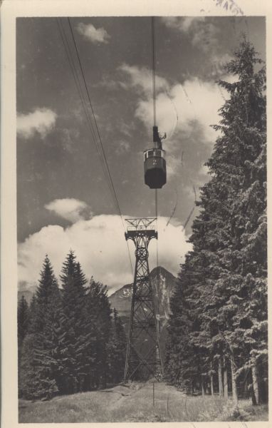Wagonik kolei linowej na Łomnicę na trasie do Łomnickiego Stawu przy podporze. Na pierwszym planie drzewa, wyżej widoczna stacja nad Łomnickim Stawem. W tle Łomnica.
