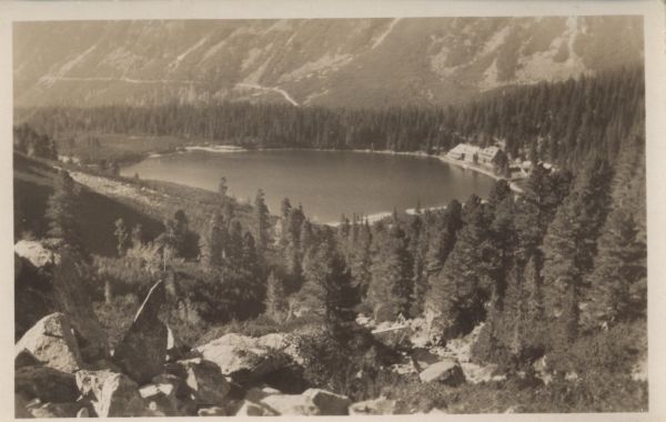 Widok na Popradzki Staw otoczony lasem. Nad jego brzegiem schronisko. Na pierwszym planie skały i las.