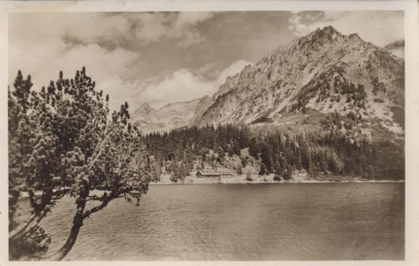 Widok na Popradzki Staw. Na pierwszym planie kosodrzewina (Pinus mugo Turra). W głębi schronisko turystyczne i las. W tle Wołowiec Mięguszowiecki i Kopa Popradzka.
