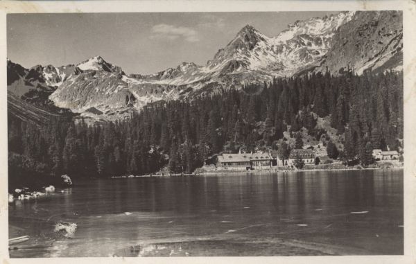 Pocztówka użyta w obiegu pocztowym, znaczek oderwany, korespondencja. Logotyp wydawcy. Dodatkowo pieczęć: P.P. Chata [] Popradského Plesa 1513 m.