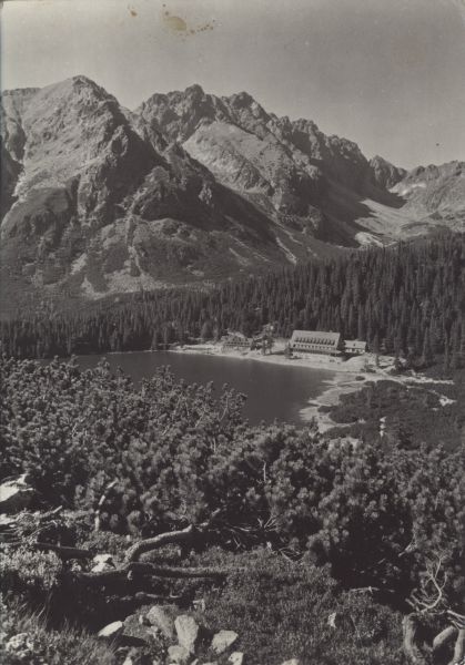 Widok na Popradzki Staw. Na pierwszym planie kosodrzewina (Pinus mugo Turra). W głębi hotel górski kpt. Stefana Moravki otoczony lasem. W tle Pośrednia Baszta i Szatan.