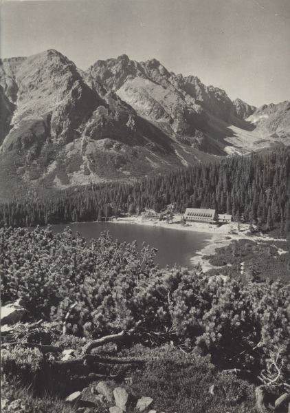 Widok na Popradzki Staw. Na pierwszym planie kosodrzewina (Pinus mugo Turra). W głębi hotel górski kpt. Stefana Moravki otoczony lasem. W tle Pośrednia Baszta i Szatan.