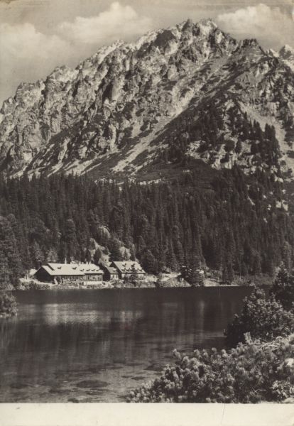 Widok na Popradzki Staw. Na pierwszym planie kosodrzewina (Pinus mugo Turra). W głębi Schronisko Vojtecha Majlátha otoczone lasem. W tle Kopa Popradzka.