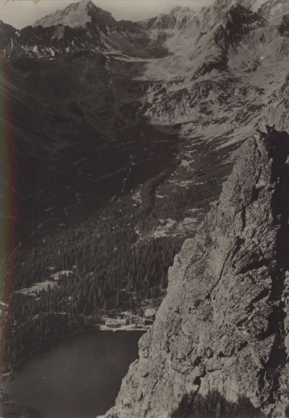 Igła w Osterwie. W dole schronisko nad Popradzkim Stawem. W tle Dolina Mięguszowiecka ze szczytami: Koprowy Wierch, Cubryna, Mięguszowiecki Szczyt.