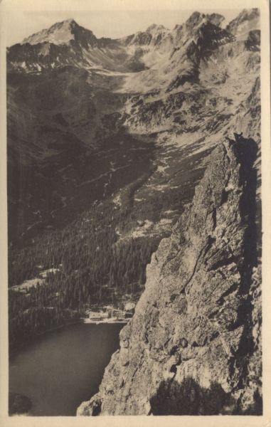 Igła w Osterwie. W dole schronisko nad Popradzkim Stawem. W tle Dolina Mięguszowiecka ze szczytami: Koprowy Wierch, Cubryna, Mięguszowiecki Szczyt.