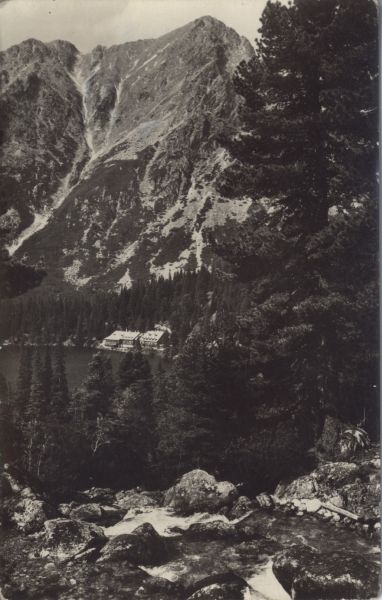 Widok na Popradzki Staw, nad jego północnym brzegiem widoczne schronisko Vojtecha Majlátha. Na pierwszym planie Zmarzły Potok. Po prawej stronie limba (Pinus cembra L.). W tle Mała i Pośrednia Baszta.