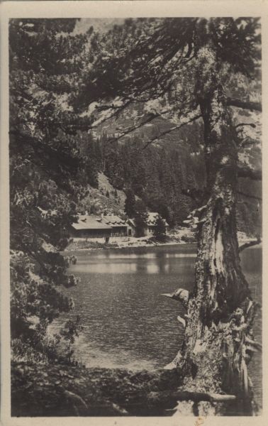 Widok na Popradzki Staw, nad jego północnym brzegiem schronisko Vojtecha Majlátha. Na pierwszym planie leżący konar drzewa. Po lewej stronie limba (Pinus cembra L.).
