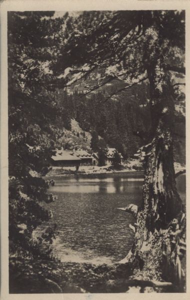 Widok na Popradzki Staw, nad jego północnym brzegiem schronisko Vojtecha Majlátha. Na pierwszym planie leżący konar drzewa. Po lewej stronie limba (Pinus cembra L.).