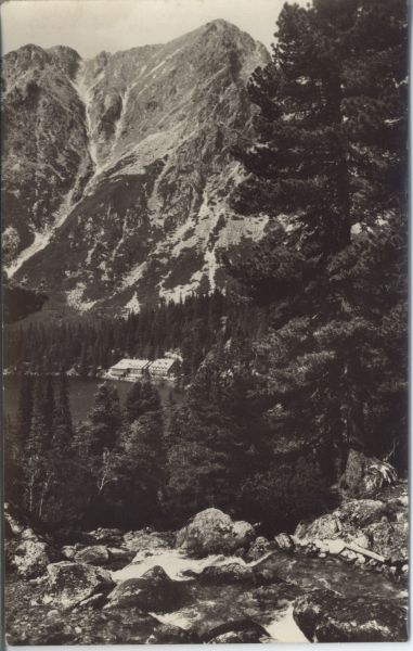 Widok na Popradzki Staw, nad jego północnym brzegiem widoczne schronisko Vojtecha Majlátha. Na pierwszym planie Zmarzły Potok. Po prawej stronie limba (Pinus cembra L.). W tle Mała i Pośrednia Baszta.