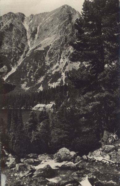 Widok na Popradzki Staw, nad jego północnym brzegiem widoczne schronisko Vojtecha Majlátha. Na pierwszym planie Zmarzły Potok. Po prawej stronie limba (Pinus cembra L.). W tle Mała i Pośrednia Baszta.