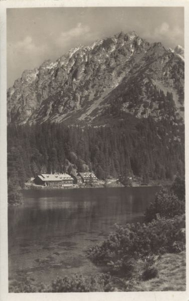 Widok na Popradzki Staw. Na pierwszym planie kosodrzewina (Pinus mugo Turra). W głębi schronisko Vojtecha Majlátha otoczone lasem. W tle Kopa Popradzka.