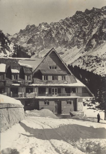 Widok na hotel górski im. kpt. ©tefana Morávki przy Popradzkim Stawie w scenerii zimowej. Przed hotelem stoj± 2 osoby.