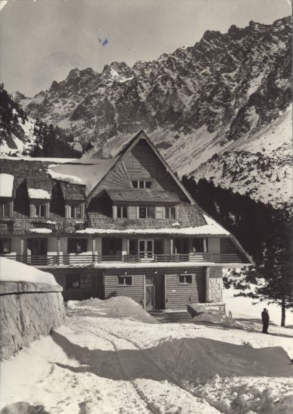 Widok na hotel górski im. kpt. ©tefana Morávki przy Popradzkim Stawie w scenerii zimowej. Przed hotelem stoj± 2 osoby.