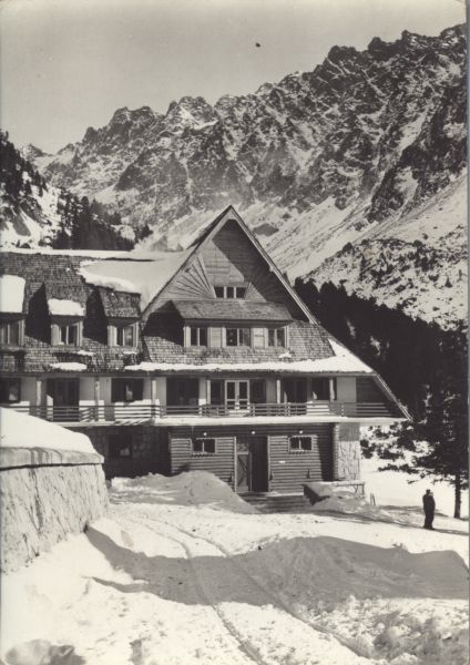 Widok na hotel górski im. kpt. ©tefana Morávki przy Popradzkim Stawie w scenerii zimowej. Przed hotelem stoj± 2 osoby.