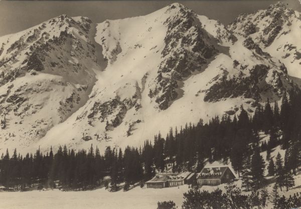 Widok na Popradzki Staw w scenerii zimowej. Na pierwszym planie zamarznięte jezioro oraz schronisko otoczone lasem. W prawym dolnym rogu kosodrzewina (Pinus mugo Turra). W tle szczyty: Pośrednia Baszta, Zadnia Baszta i Szatan.