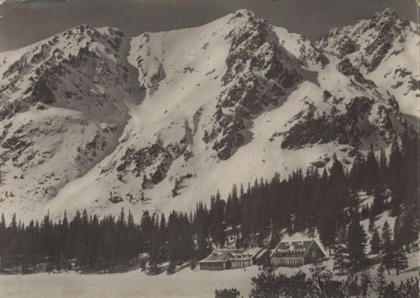 Widok na Popradzki Staw w scenerii zimowej. Na pierwszym planie zamarznięte jezioro oraz schronisko otoczone lasem. W prawym dolnym rogu kosodrzewina (Pinus mugo Turra). W tle szczyty: Pośrednia Baszta, Zadnia Baszta i Szatan.