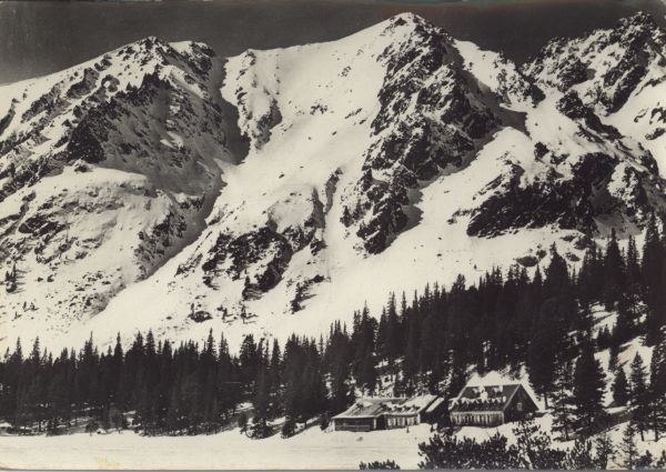 Widok na Popradzki Staw w scenerii zimowej. Na pierwszym planie zamarznięte jezioro oraz schronisko otoczone lasem. W prawym dolnym rogu kosodrzewina (Pinus mugo Turra). W tle szczyty: Pośrednia Baszta, Zadnia Baszta i Szatan.