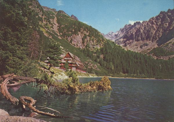 Tatry Wysokie. Popradzki Staw, na lewo Hotel górski, w prawo stoki Tępej nad Doliną Złomisk.