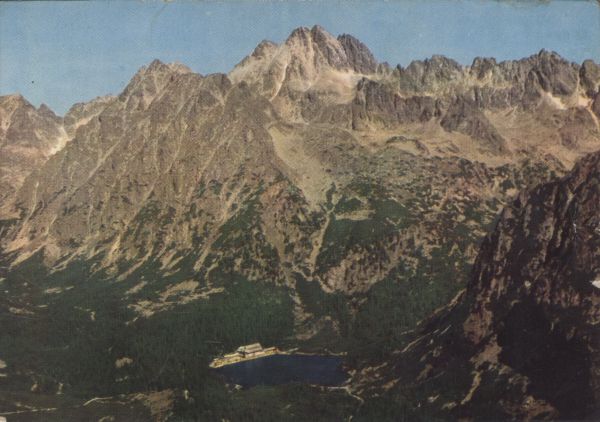 Tatry Wysokie - Popradzki Staw. Popradzki Staw ze schroniskiem im. kpt. Štefana Morávki i szczyt Wysokiej. Tytuł również w języku: niem., ang., fr.