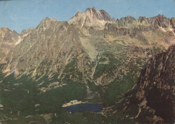 Tatry Wysokie - Popradzki Staw. Popradzki Staw ze schroniskiem im. kpt. Štefana Morávki i szczyt Wysokiej. Tytuł również w języku: niem., ang., fr.