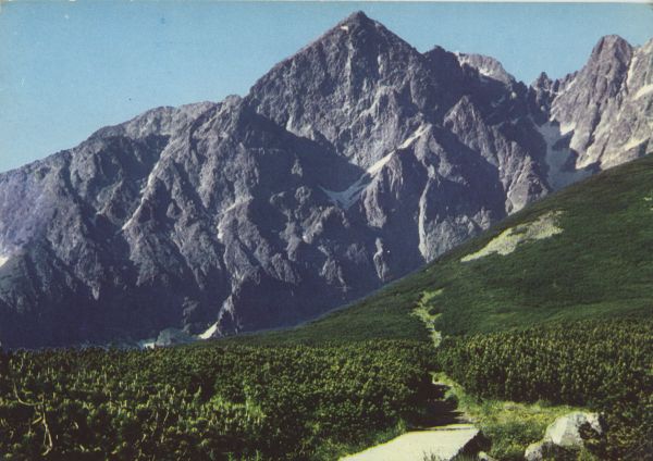 VYSOKÉ TATRY. VYSOKIE TATRY - HOHE TATRA - THE HIGH TATRAS. Pohµad od Keľmarskej chaty na severnú stenu Malého Keľmarského ątítu (2513 m), za ním Lomnický ątít (2632 m), vpravo Pyąný ątít (2591 m).