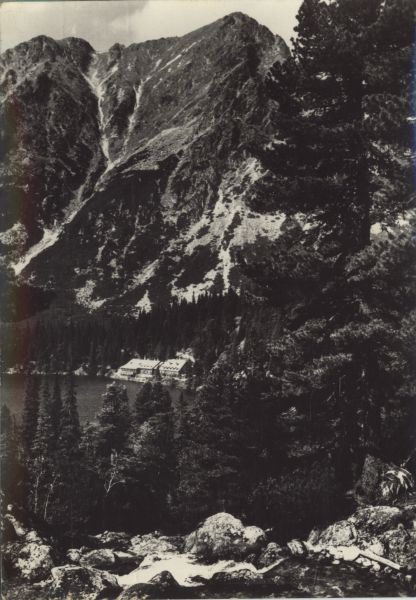 Pocztówka użyta w obiegu pocztowym, korespondencja. Logotyp wydawcy. Dodatkowo pieczęć: P.P. Chata [] Popradské Pleso 1513 m.