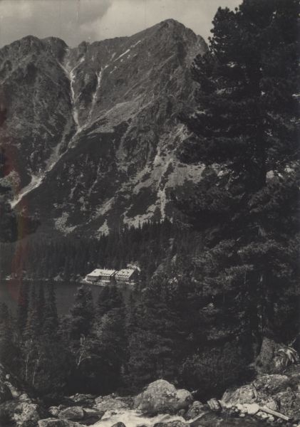 Widok na Popradzki Staw, nad jego północnym brzegiem widoczne schronisko turystyczne. Na pierwszym planie Zmarzły Potok. Po prawej stronie limba (Pinus cembra L.). W tle Mała i Pośrednia Baszta.