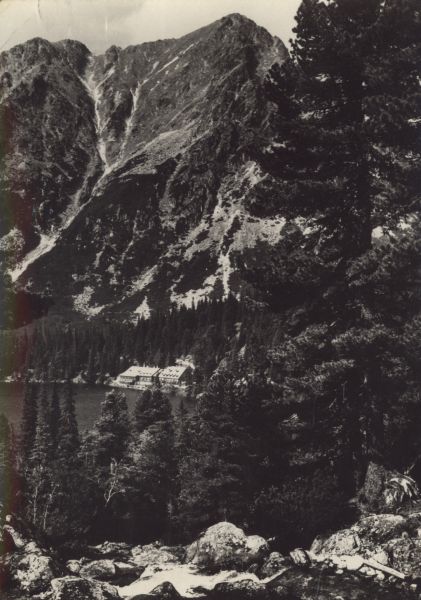 Widok na Popradzki Staw, nad jego północnym brzegiem widoczne schronisko. Na pierwszym planie Zmarzły Potok. Po prawej stronie limba (Pinus cembra L.). W tle Mała i Pośrednia Baszta.