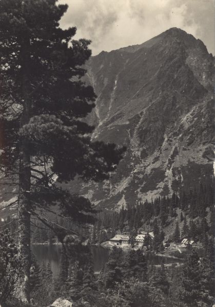 Widok na Popradzki Staw. Na pierwszym planie skały i młode drzewa. Po lewej stronie limba (Pinus cembra L.). W głębi Popradzki Staw otoczony lasem, nad jego północnym brzegiem widoczne schronisko. W tle Pośrednia Baszta.