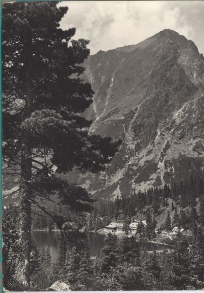 Widok na Popradzki Staw. Na pierwszym planie skały i młode drzewa. Po lewej stronie limba (Pinus cembra L.). W głębi Popradzki Staw otoczony lasem, nad jego północnym brzegiem widoczne schronisko. W tle Pośrednia Baszta.