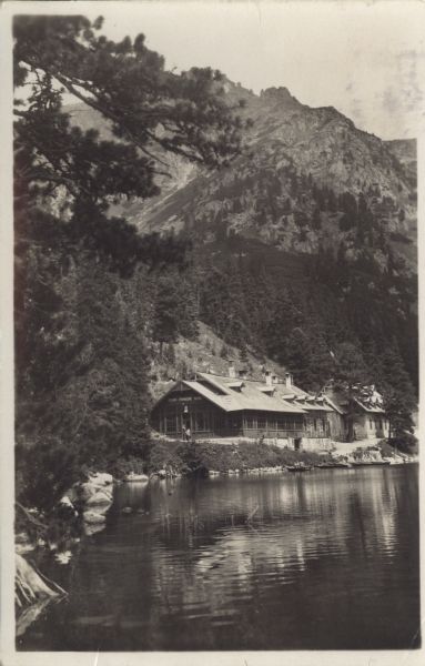 Widok na Popradzki Staw, nad jego północnym brzegiem schronisko turystyczne. Przed schroniskiem stoją 2 osoby. Po lewej stronie gałęzie limby (Pinus cembra L.).