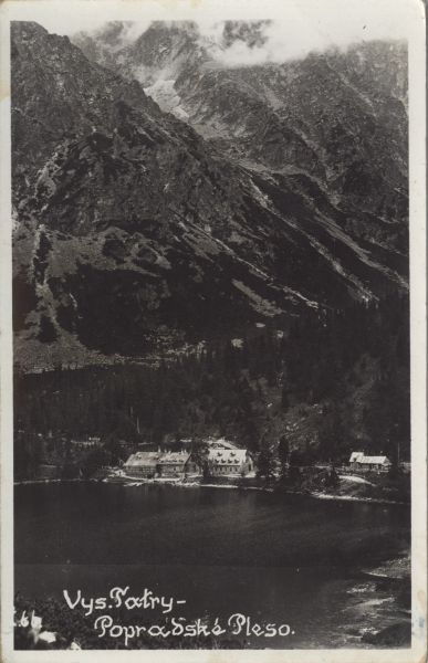 Widok na Popradzki Staw i Dolinę Mięguszowiecką. Nad północnym brzegiem stawu schronisko turystyczne. W tle grań Baszt. (Na dole odręcznie pisany tytuł pocztówki).