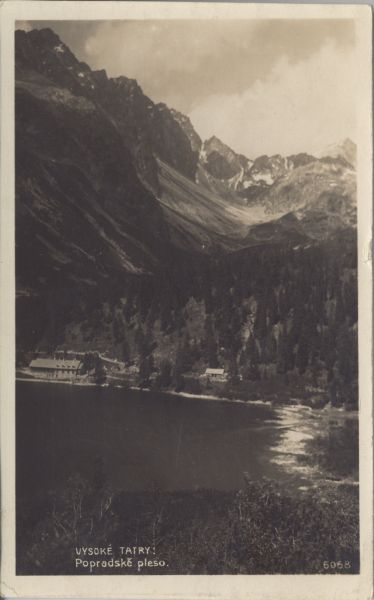 Widok na Popradzki Staw, nad jego północnym brzegiem schronisko. Na pierwszym planie kosodrzewina (Pinus mugo Turra). W tle szczyty od lewej: Szatan, Zadnia Baszta, Hlińska Turnia, Mała Koprowa Turnia, Koprowy Wierch. (Na dole odręcznie pisany tytuł pocztówki).