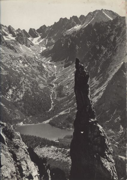 Widok na Popradzki Staw i Dolinę Złomisk. Na pierwszym planie Basztowa Igła w Skrajnej Baszcie. W tle szczyty otaczaj±ce Dolinę Złomisk, od lewej ¦nieżna Kopa, Wschodni Żelazny Szczyt, Zmarzły Szczyt i Kończysta.