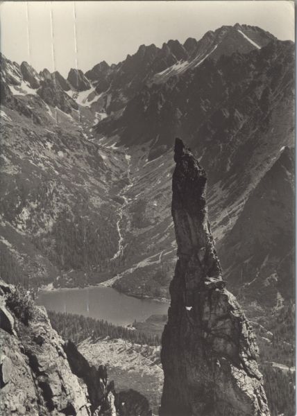 Widok na Popradzki Staw i Dolinę Złomisk. Na pierwszym planie Basztowa Igła w Skrajnej Baszcie. W tle szczyty otaczaj±ce Dolinę Złomisk, od lewej ¦nieżna Kopa, Wschodni Żelazny Szczyt, Zmarzły Szczyt i Kończysta.