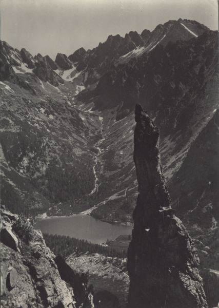Widok na Popradzki Staw i Dolinę Złomisk. Na pierwszym planie Basztowa Igła w Skrajnej Baszcie. W tle szczyty otaczaj±ce Dolinę Złomisk, od lewej ¦nieżna Kopa, Wschodni Żelazny Szczyt, Zmarzły Szczyt i Kończysta.
