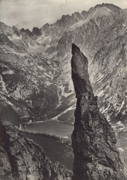 Widok na Popradzki Staw i Dolinę Złomisk. Na pierwszym planie Basztowa Igła w Skrajnej Baszcie. W tle szczyty otaczające Dolinę Złomisk, od lewej Śnieżna Kopa, Wschodni Żelazny Szczyt, Zmarzły Szczyt i Kończysta.