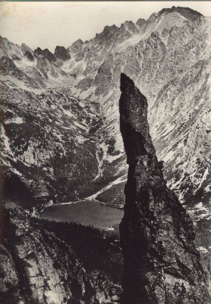 Widok na Popradzki Staw i Dolinę Złomisk. Na pierwszym planie Basztowa Igła w Skrajnej Baszcie. W tle szczyty otaczające Dolinę Złomisk, od lewej Śnieżna Kopa, Wschodni Żelazny Szczyt, Zmarzły Szczyt i Kończysta.