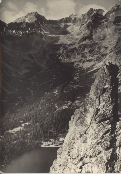 Igła w Osterwie. W dole schronisko nad Popradzkim Stawem. W tle Dolina Mięguszowiecka ze szczytami: Koprowy Wierch, Cubryna, Mięguszowiecki Szczyt.