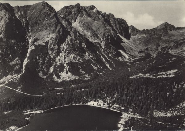 Widok na Popradzki Staw i Dolinę Mięguszowiecką. Nad górnym brzegiem stawu widoczne schronisko otoczone lasem. W tle szczyty: Mała Baszta, Przednia Baszta, Szatan, Zadnia Baszta, Koprowa Przełęcz i Koprowy Wierch.
