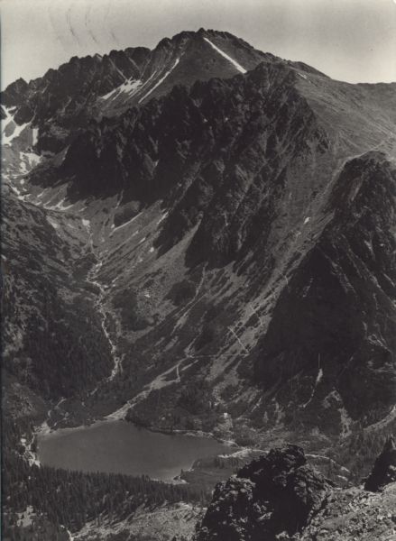 Tatry Wysokie - widok ze Skrajnej Baszty na Popradzki Staw i Dolinę Złomisk. Tytuł również w języku: ros., ang., niem.